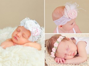 {Jessa Headband (left) Features silk rosettes and freshwater pearls. | Lace Rosette Headband in Pink (top right) Ostrich plume feathers accent the pink lace rosette. | Pink Carnation Headband (bottom right) A simple pink crown of satin carnations.}