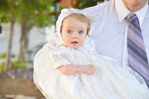 The little sister to our stunning Sophi gown, Chloe coordinates perfectly with the Sophi accessories; each features the silk, laces, and trims utilized on the gown: a show-stopping lace and ostrich headband, a gorgeous yet practical bib, dainty floral slippers, and a richly ruffled blanket. Any or all will add an air of luxury to her very special day.