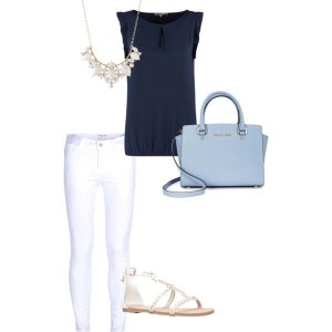 Skinny jeans are a mom’s best friend! White is a crisp, clean look for spring. Paired with a flowy blouse in navy blue. Accessorize with a white statement necklace and strappy sandals. Add a pop of color with a light blue handbag. Cute!