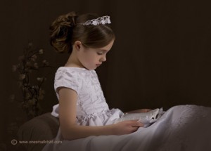 New for 2009, the Miss Hannah First Communion dress is now available for purchase exclusively at One Small Child. This pretty dress features traditional ball-gown styling with dainty floral embroidery, beads, and a lovely peek-a-boo cutaway back. Available in girls’ sizes 6-12.