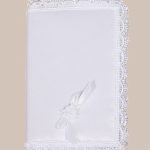 Champagne (slightly off white) Silk Dupioni blanket with rayon venise trim, poly satin bow and a small crochet applique in one corner. All natural silk fabrics have slubs which are an inherent part of the fibers and add to the individuality of the set. Backing is 100% cotton flannel. Dry clean. Packaged in vinyl bag. Approximate size: 30" x 40". (3DPGBK2)