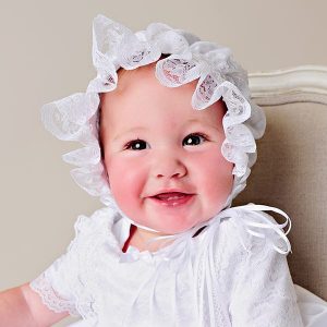 As a bonus, we include a matching baby christening bonnet. An exaggerated ruffle softly brushes baby’s sweet face. A thick satin band accentuates a fully-lined puff style bonnet. The open back design is indicative of a vintage inspired headpiece. Thin triple strand satin ribbons tie under the chin for a secure fit.