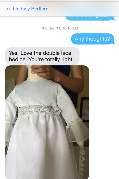 The next step was to draft the technical drawings. This gives us a more in-depth idea of how to construct the gown. From this, we made our first sample. Lindsay and I shared pictures back and forth via text.