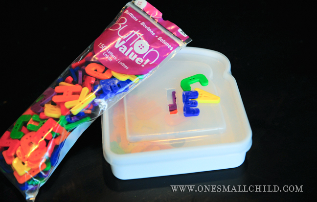 First- this was one of our FAVORITES! Super simple and inexpensive. I purchased fun buttons and a sandwich container. I cut a hole large enough for the buttons and kept the buttons in a bag in the container to pull out when we were ready to play. He loved placing the buttons in the hole and this activity saved us from a few melt downs.