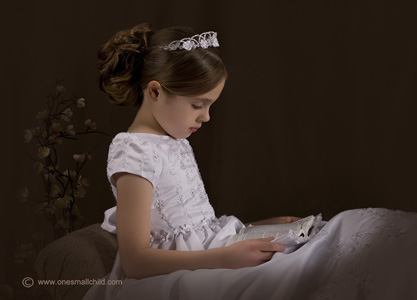 New for 2009, the Miss Hannah First Communion dress is now available for purchase exclusively at One Small Child. This pretty dress features traditional ball-gown styling with dainty floral embroidery, beads, and a lovely peek-a-boo cutaway back. Available in girls’ sizes 6-12.