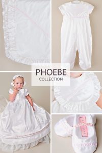 Our Phoebe was designed to be the counter-part to the Francis. It co-ordinates flawlessly! The Phoebe features the same modern design as the Francis, with a few feminine additions. We added a lovely monogram to the gown and lush silk ruffles to the blanket and bib. The collection includes: baptism gown, after-Christening romper, jacket, bib, blanket and shoes.