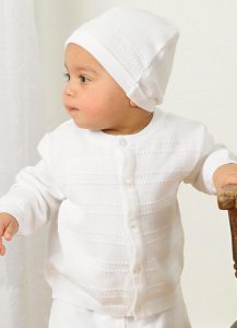 If you’re currently melting in sweltering heat, take a moment to gaze at this adorable baby boy, visualize the sensation of being all cozy when it’s freezing outside, and get back to enjoying your summer! Thanks to his mamma for sharing her experience with our knit Aiden Baptism Outfit.