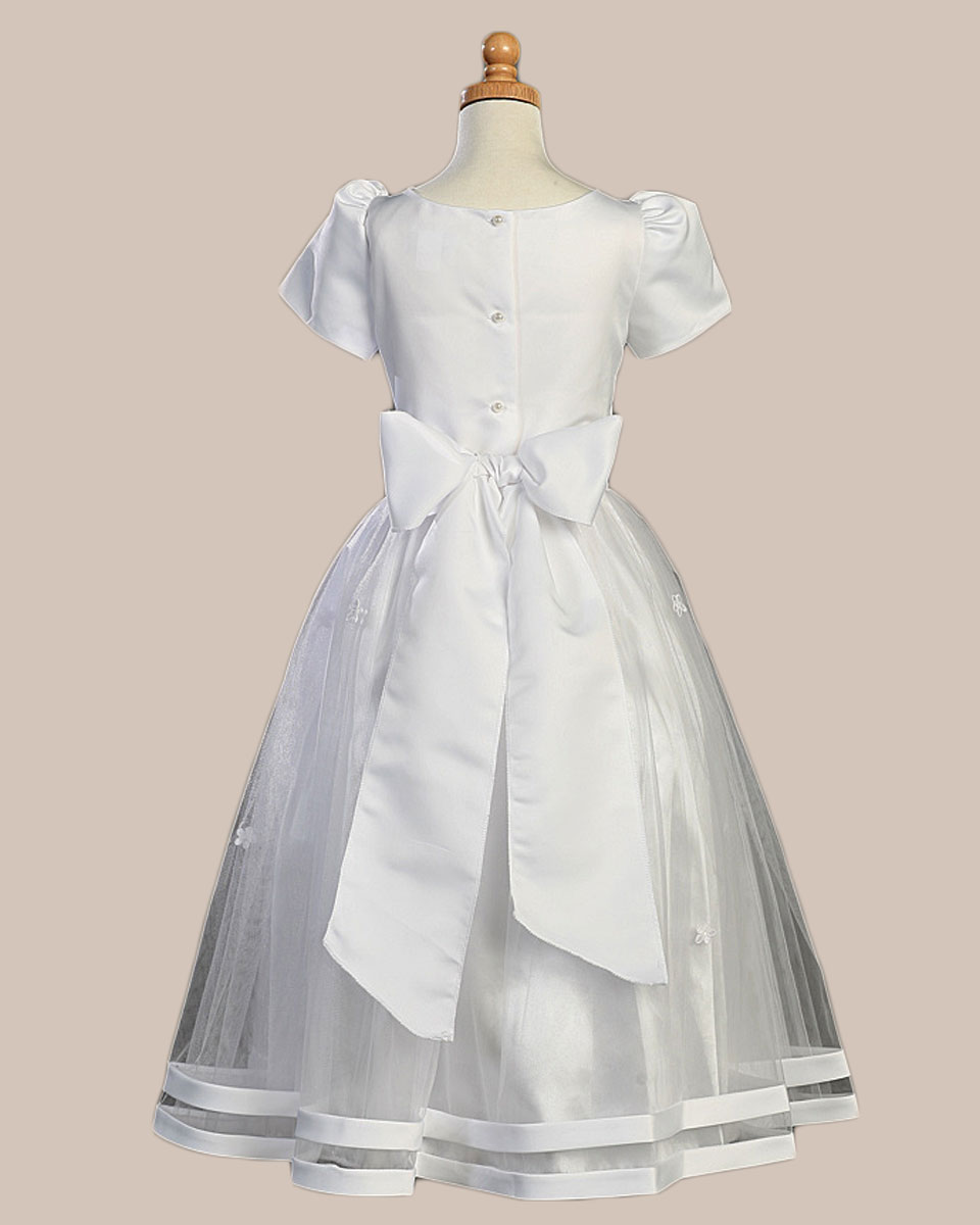 White Satin Communion Baptism Dress with Tulle Skirt – One Small Child