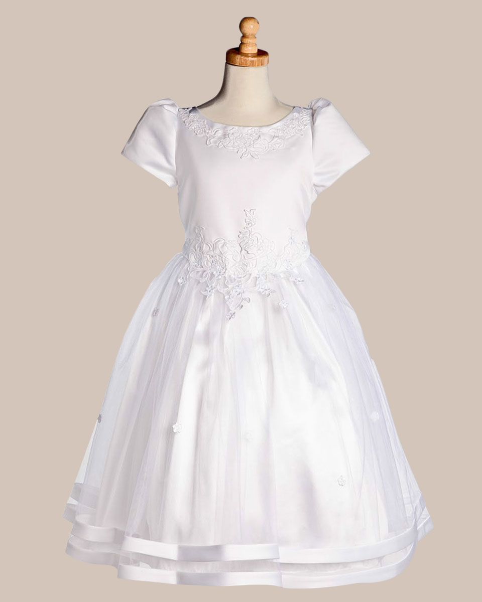 White Satin Communion Baptism Dress with Tulle Skirt – One Small Child