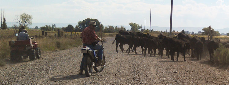 I giggled, then realized that is the extent of traffic he’s accustomed to.  I love living out in the open…where commute time doesn’t have to factor in stop-start road congestion, and every once in awhile you can be a drive-up party to this kind of road block on your very own street: