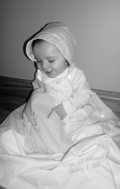 Today we’re featuring an adorable little man in our Justin Baptism Gown on our customer highlight series. Sergio’s gown was embroidered with our gold name and date embroidery option. His Godmother also purchased the Boys Christening Accessory Set for Sergio’s big day.