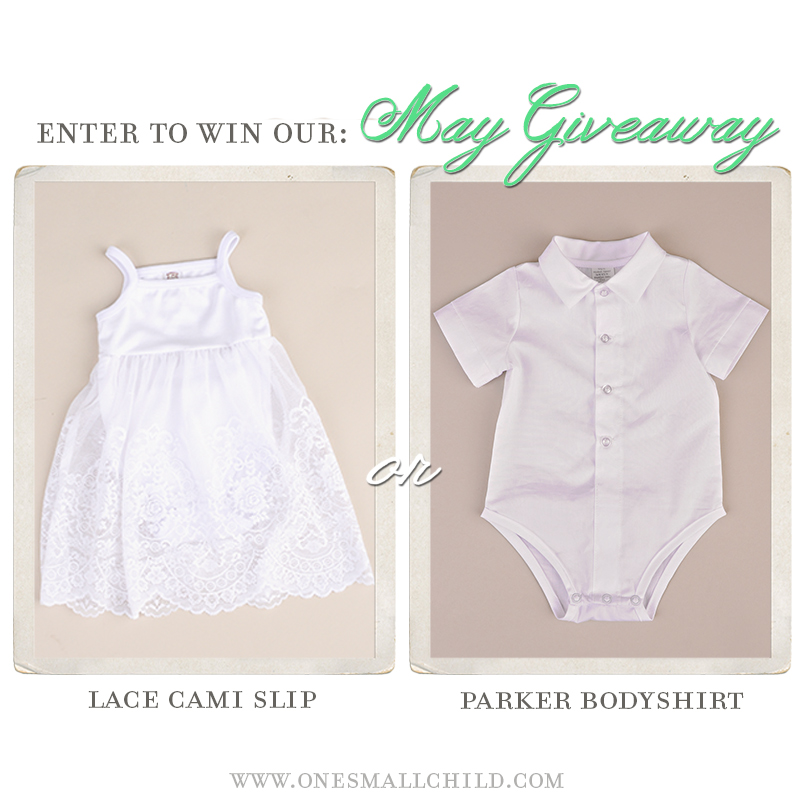 For our May Giveaway, we’re giving away one of these shirts along with a $25 shopping code to One Small Child. Obviously this sweet little item is all-boy, so if you happen to have a girl, we’re offering you the option of our adorable Lace Cami Slip with the $25 shopping code.