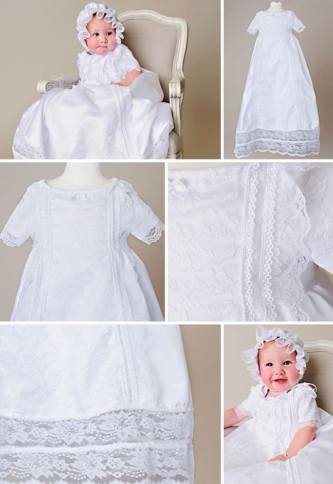 {Our Memory Christening Gown, Memory Christening Slippers and Lace Rosette Headband in the ivory option are pictured above.}
