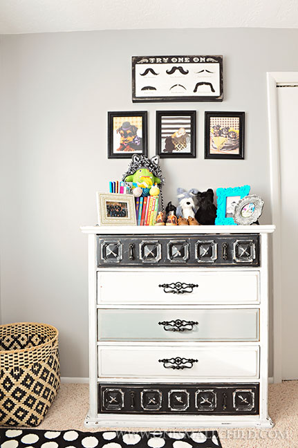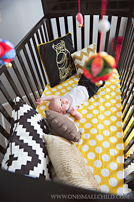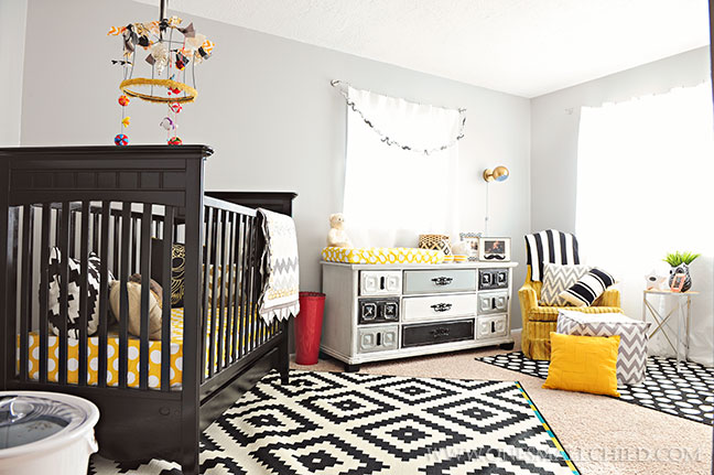 Laurie did a masterful job of mixing bold, on-trend graphic patterns in shades of black, grey, gold and cream with well-placed pops of bright red, orange and turquoise in her nursery decor. The ‘Little Gentleman’ mustache theme ties it all together in an adorable tongue-in-cheek way.