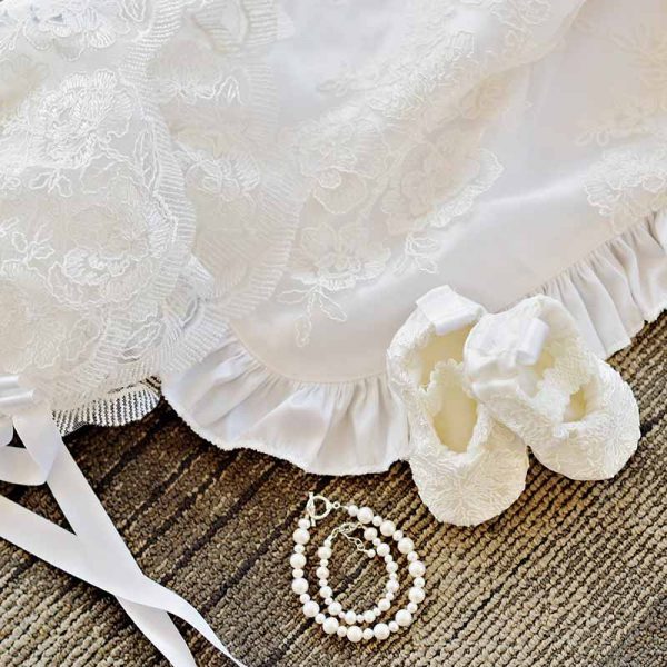 Gorgeous embroidery and intricate beadwork graces tulle lace and rich silk. The Preslee Silk Christening Gown is simply stunning!