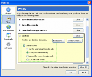 - The Enable cookies checkbox must be checked, and Accept all cookies should be selected in the “Normal cookies” drop-down