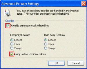 - Put a check mark in the box for Override Automatic Cookie Handling, put another check mark in the Always accept session cookies box