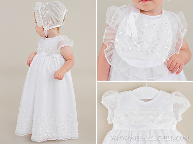 The two-piece Elise set includes dress and bonnet. Complete the look with our Erin Christening Slippers, Elise Bib (coming soon) and Camisole Bodysuit with shamrock embroidery option.