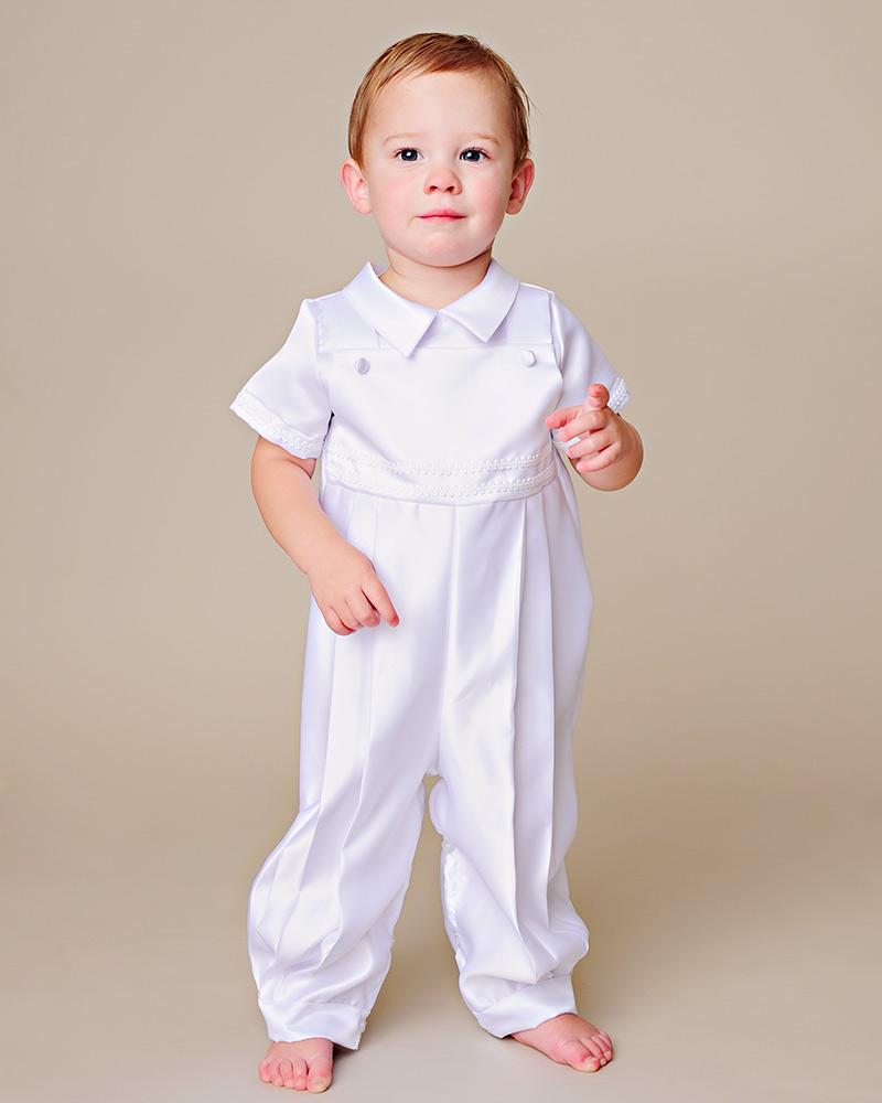With short sleeves and long legs, this romper is a great fit for year-round christenings–a nice, soft mid-weight satin with classic details (just add a sweater if the weather’s cool). The braid trim detail is just gorgeous but done in a way that keeps the overall look masculine. And here’s a bonus: if you happen to have twins, or want your new little boy’s outfit to look similar to the gown his big sister wore (or vice-versa), Sawyer looks stunning next to our Satin Christening Gowns.