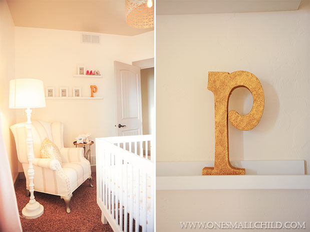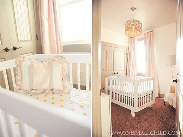 My favorite details of her little domain (it’s hard to pick just a few) include her gold polka-dot bedding, the painted stick display rod, and the crib in the center of the room beneath that gorgeous light fixture. So well done!