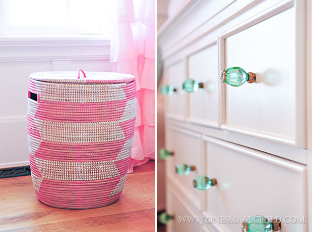 {Shiny aqua dresser pulls and a patterned clothes hamper are fun finishing details.}