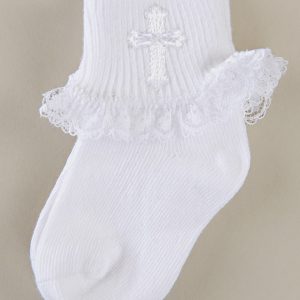 Girls White Lace Ruffle Socks with Cross