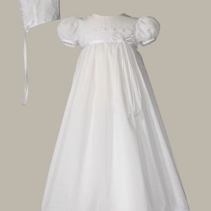 Girls 32″ Cotton Sateen Christening Gown with Rosette Covered Bodice