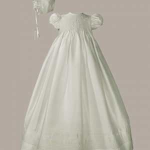 Girls 32″ White Silk Christening Baptism Gown with Smocked Bodice
