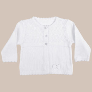 Girls White 100% Cotton Sweater with Diamond Knit Bodice and Rosebud Trim