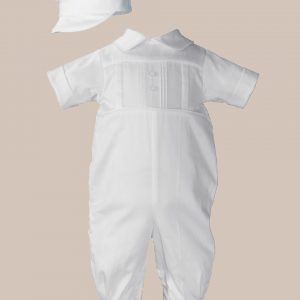 Boys Cotton Sateen Short Sleeve Christening Baptism Coverall with Pleated Front and Hat
