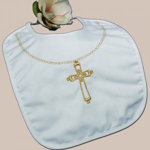 Cotton Christening Bib with Fancy Embroidered Gold Chain and Ornate Cross