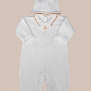 Boy’s Soft Cotton Knit Christening Baptism Longall w/ Gold Cross and Hat
