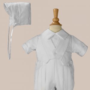 Boys Cotton Sateen Short Sleeve Christening Baptism Coverall with Pleated Front and Hat