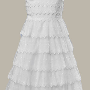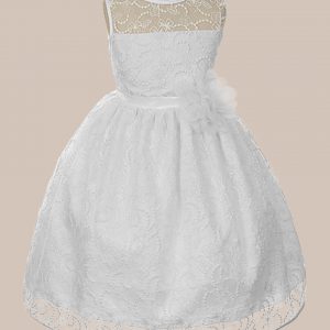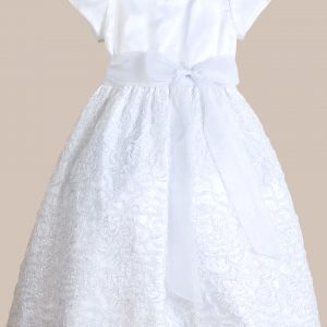 White Tricot Lace Frosting Communion Baptism Dress with Embroidered Dots and Flowers
