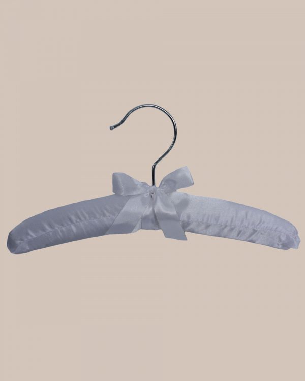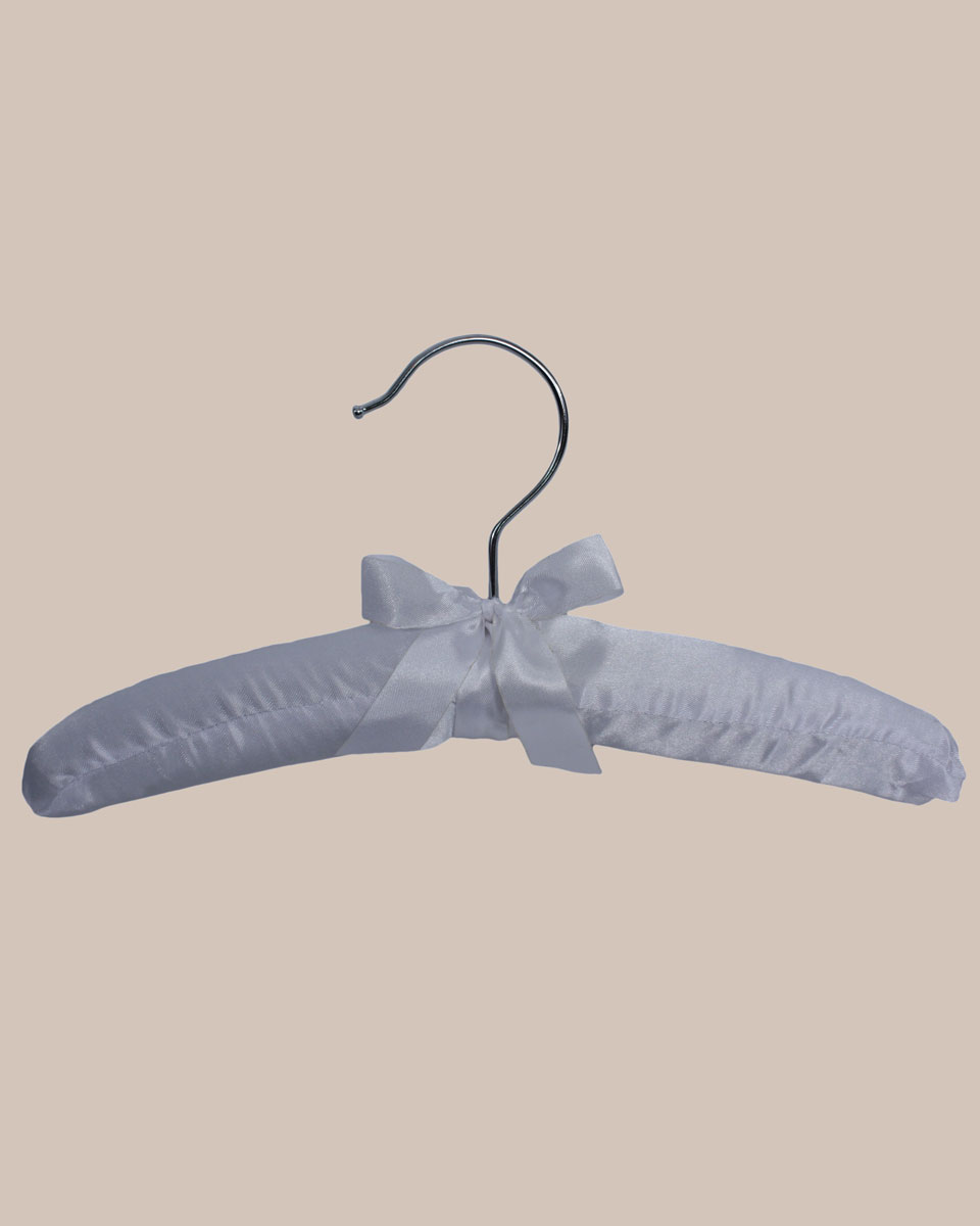 Our 10” white satin hanger is elegant, padded, very strong and will securely hold baby and children's clothing. Features a cotton padded hanger with a small bow and strong metal hook.