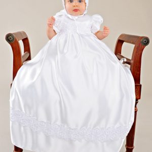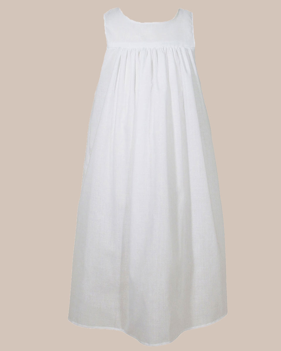 A simple 22″ – 23″ poly cotton straight slip with a skirt gathered onto the bodice to add extra body to a christening gown.