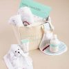 • 8-piece gift set includes personalized tote, 2 assorted cotton swaddle blankets, easy swaddle baby wrap, lovey, lotion, ointment, burpy bib