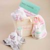8-piece gift set includes personalized tote, 2 assorted cotton swaddle blankets, easy swaddle baby wrap, lovey, lotion, ointment, burpy bib