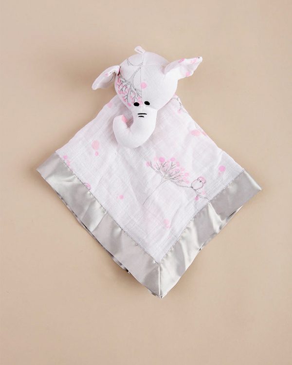 Elephant lovey features smooth grey satin edges