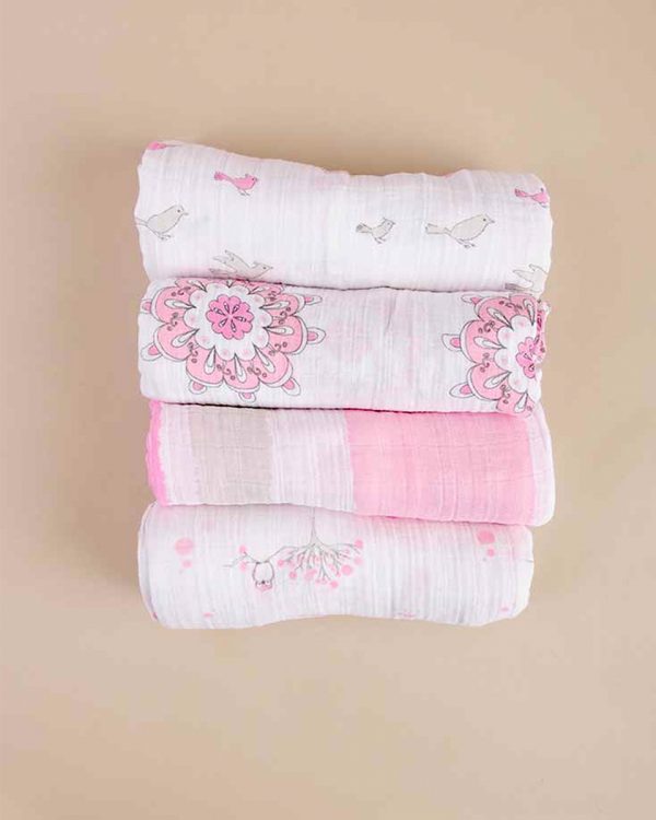 Cotton muslin swaddle blankets measure approximately 47″ x 47″