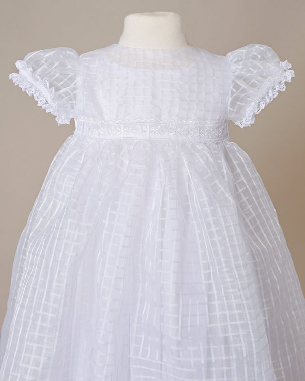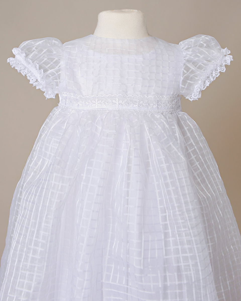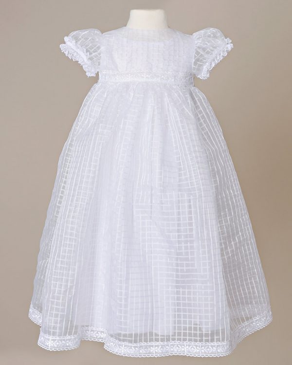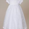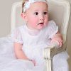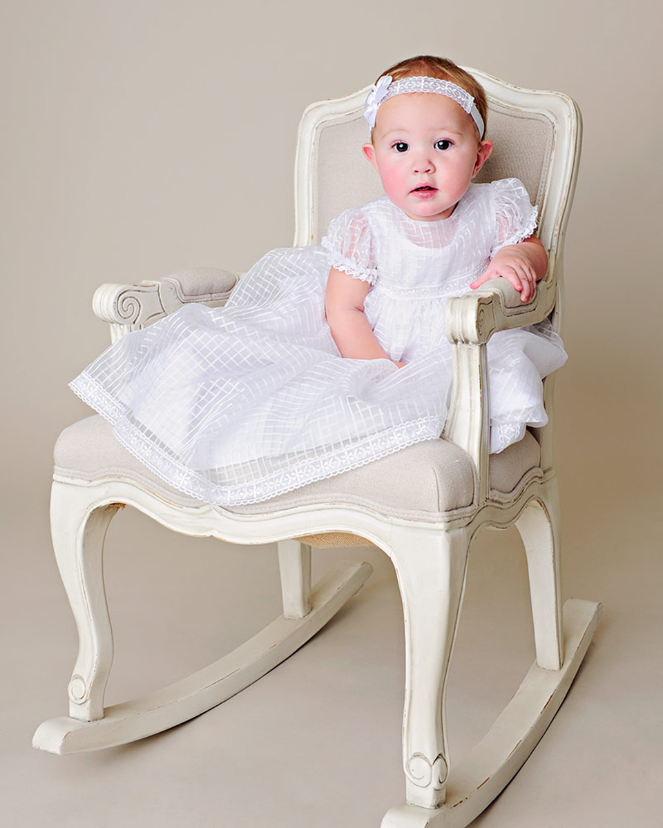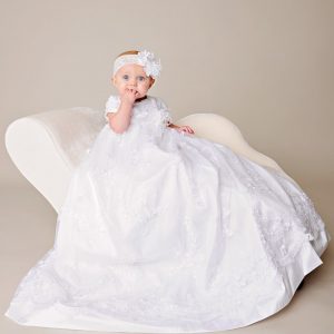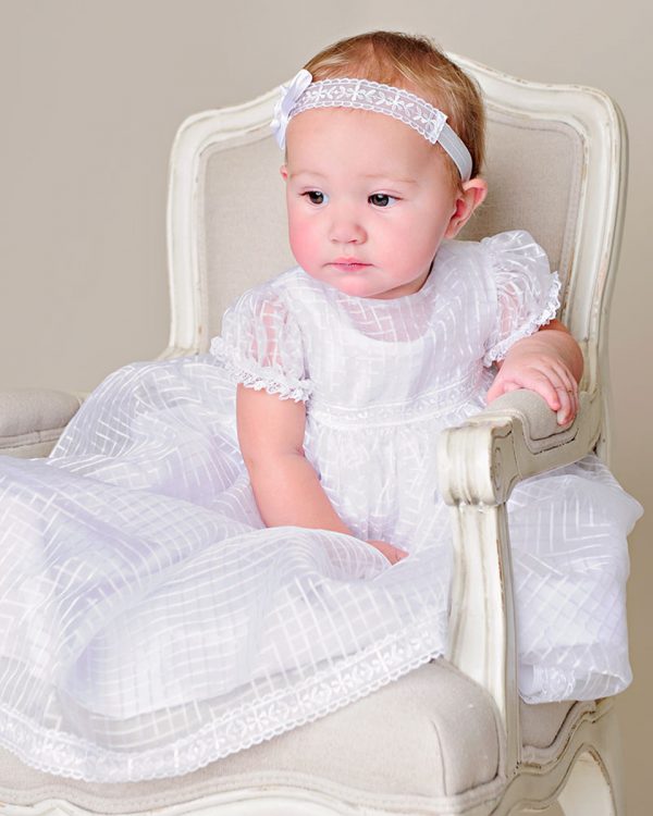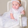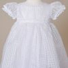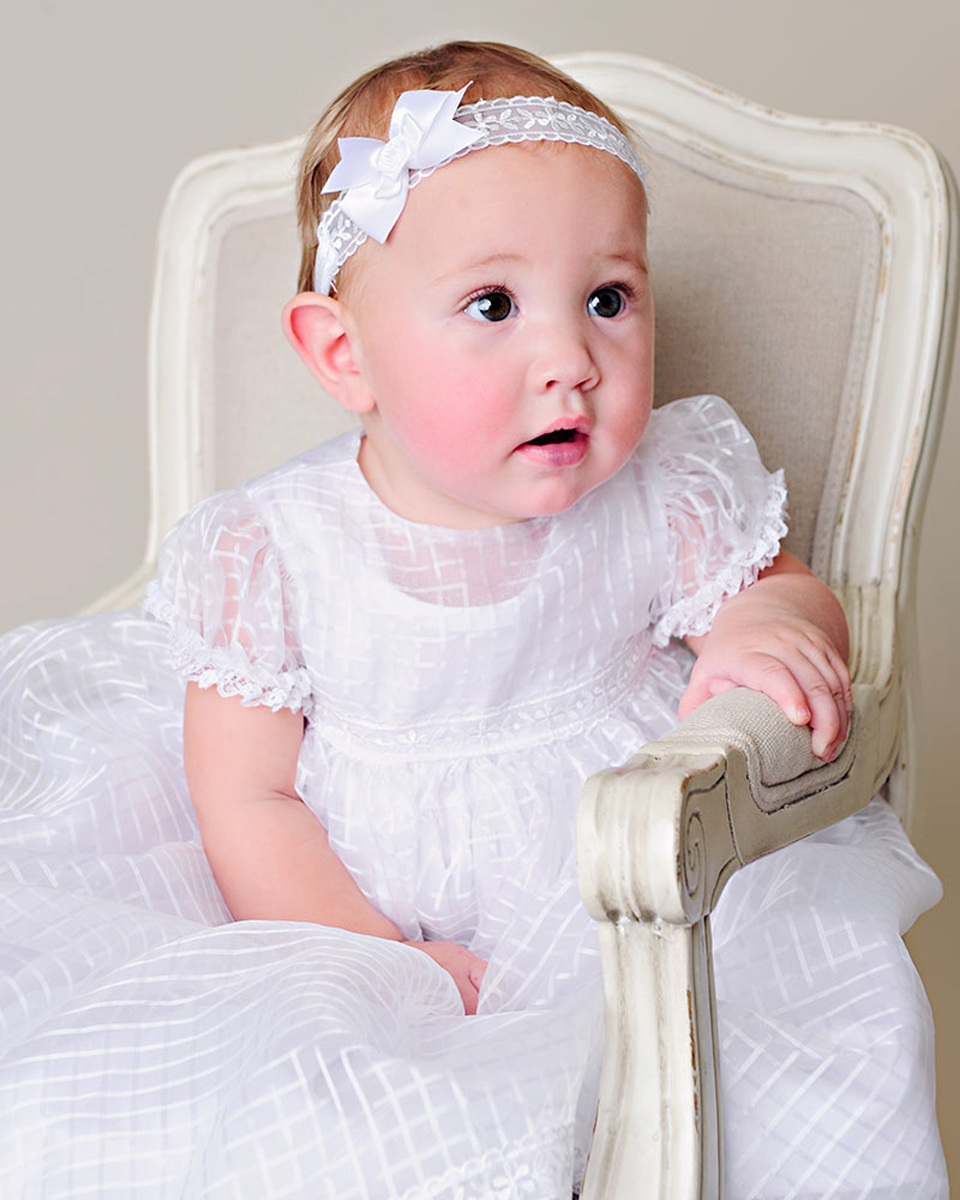 This dainty Christening Dress is perfect for your baby’s Spring and Summer events. The lightweight sheer nylon dress overlays an ultra soft cotton slip. The satin bow headband adds the perfect touch to her angelic head. An added monogram will peek through the sheer dress–so cute!