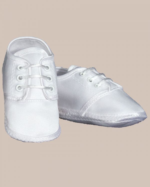 Beautifully constructed boys oxford Christening crib shoe. This elegant shoes features a matte satin oxford style with a soft cloth bottom out-sole. Made of a soft and light weight 100% polyester, the cotton insole helps these shoes stay comfortable on your baby’s feet all day long. The shoe string lace tie makes putting this shoe on a breeze and helps keep them snug and on your baby’s foot! The shoe string lace tie makes putting this shoe on a breeze and helps keep them snug and on your baby’s foot!