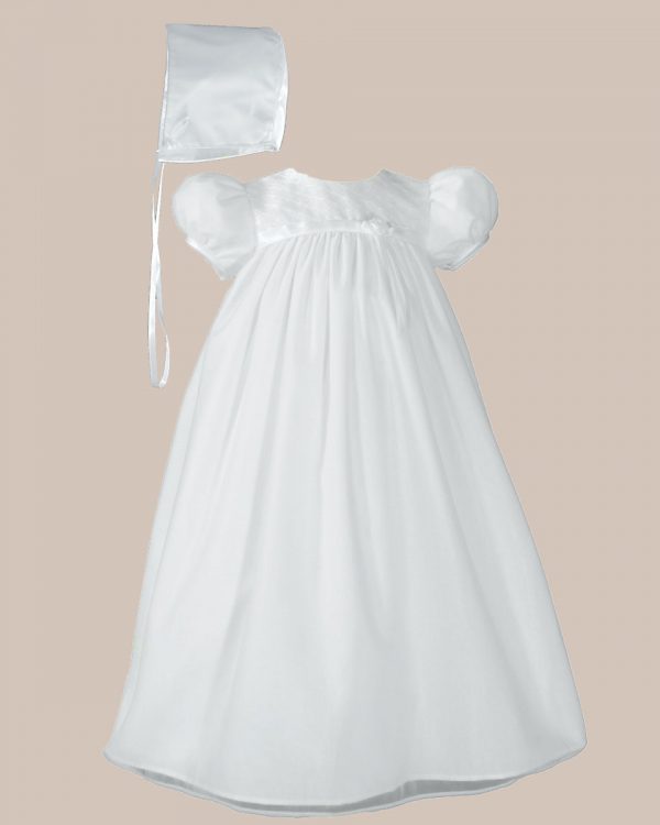 Beautiful girl’s poly cotton nylon tricot gown with embroidered bodice. Fully lined with lightweight taffeta. The gown measures 25 inches in length; includes a matching bonnet. The Little Things Mean a Lot Heirloom Preservation Bag is recommended for long-term storage. Slip available separately. This elegant gown is perfect for Christening, Baptism, Baby Blessing, or any special occasion such as weddings, church presentations, dedications, and keepsake photos. Please see our size chart in the images for accurate measurements. (BJ06GS)