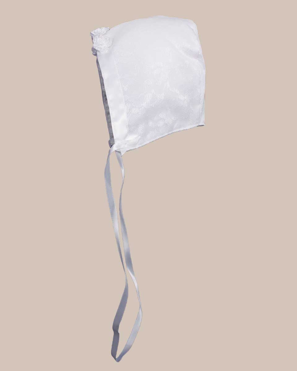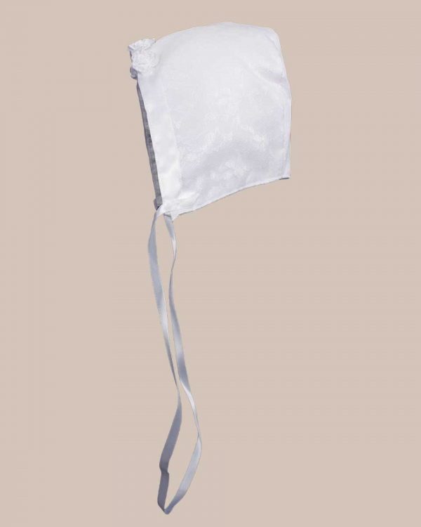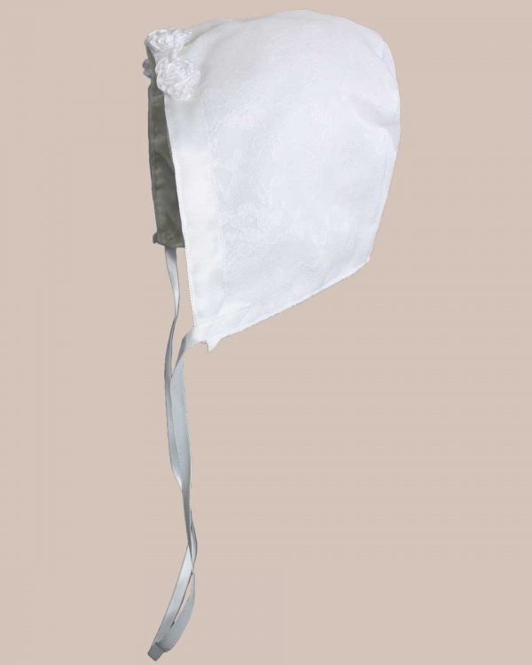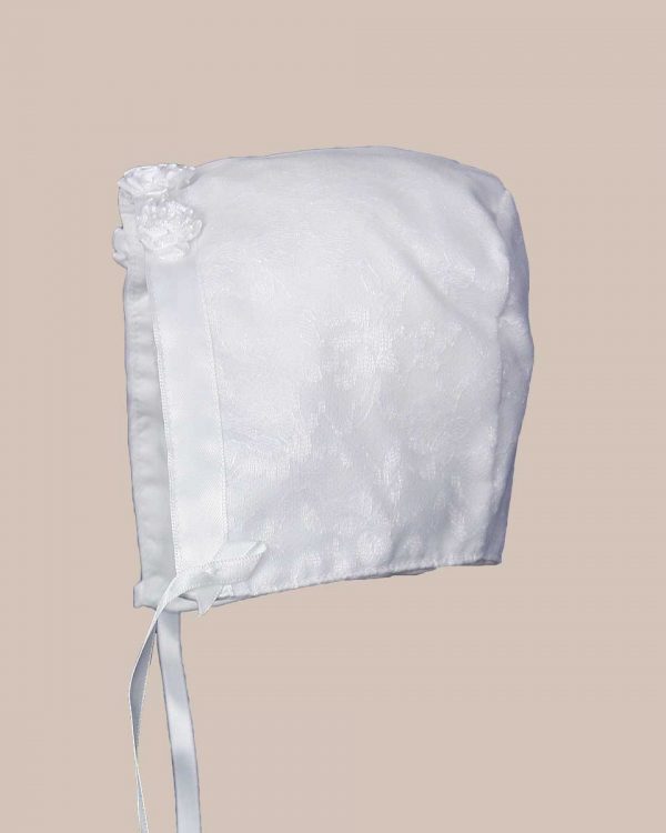 A beautiful baby girls cap/hat featuring three flower accents on the crown, ribbon trim on the brim and hang ties, and a lace overlay all around.