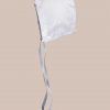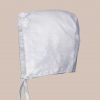 Elegant white special occasion cap/hat for your baby girl.  Features 3 flower accents on the crown of the hat, ribbon trim on the brim and hang ties, and a lace overlay all around.  Fully lined for maximum comfort.  Made from a 65% Polyester 35% Cotton blend.  Hand wash. (BJ07H)