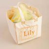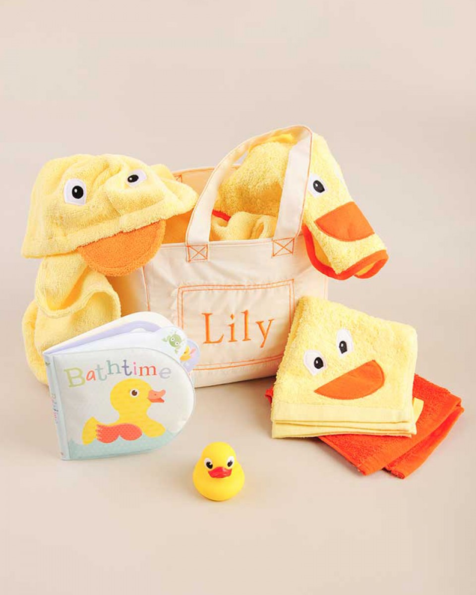 - 7-piece set includes: our personalized muslin tote, duckie towel, book, duckie, 2 washcloths, and a bib