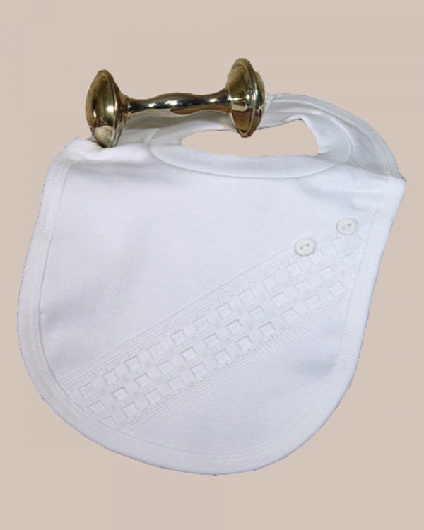 Beautiful bib accented with handsome windowpane trim and buttons for a very dressy masculine look. Hand washable. Hand made of ultra-soft 100% cotton interlock. Approximate size: 7″ x 7″. (WF235XB)