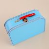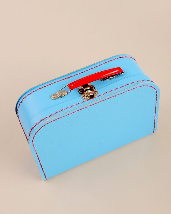 - Blue suitcase is made of sturdy cardboard, approximately 12″ wide x 8″ deep x 4″ tall