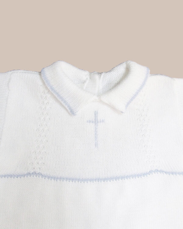Detail: Hand embroidered light periwinkle blue cross on the bodice, with a periwinkle detail line across chest and on edges of: collar, sleeve, pant leg.