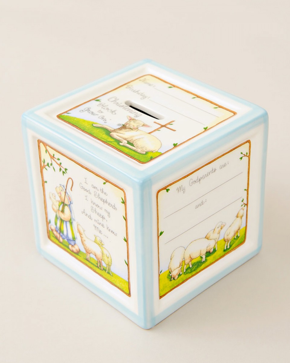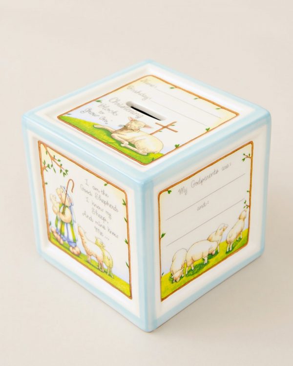 Charmingly illustrated with little lambs & shepherds, this porcelain christening bank features a place to record everything about baby’s special day.
